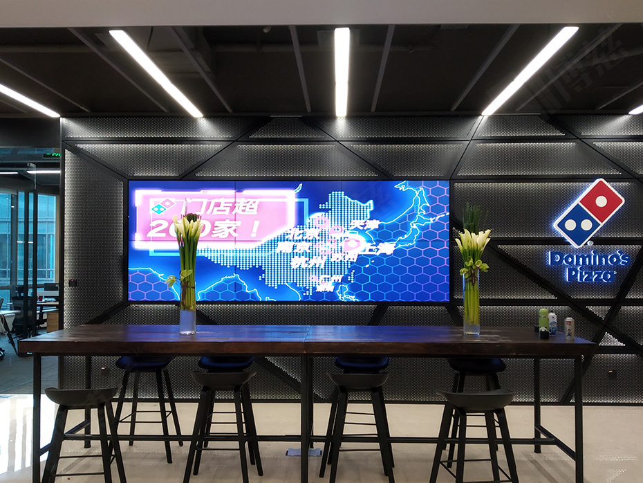此次与博慈联手合作的达美乐披萨(Domino's Pizza)位于上海日月光A座8楼,步入达美乐披萨(Domino's Pizza)迎面袭来的则是博慈为其采用的三星系列终端显示产品,同时该产品以具备的三星工业级面板、极致窄边拼接屏缝隙在液晶拼接市场中较为突出的三星1.7mm55寸液晶拼接屏。近年来,根据终端显示市场数据,液晶拼接屏作为高端视觉体验的使者,在各大行业中以不同角色频频出现,以高、大、上的姿态为用户及受众者的视觉营造出切实、多彩的感官体验。